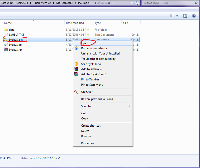 Sau khi tải phần mềm Tuner E về máy tính bàn, laptop, các bạn giải nén lưu phần mềm vào ổ cững lưu trữ dùng lâu dài. Mở thử mục và chúng ta tiến hành chay file "Syaku8. exe":
